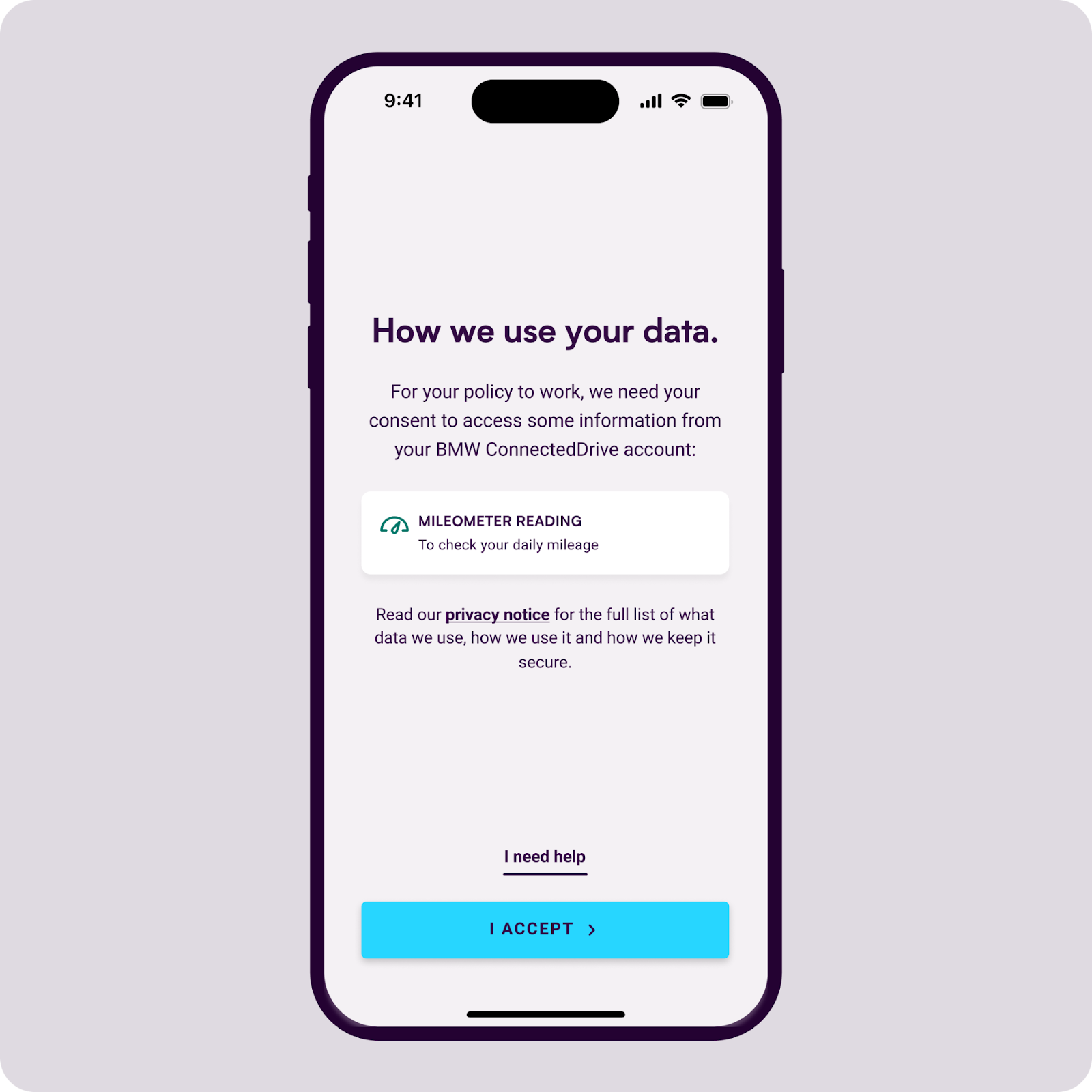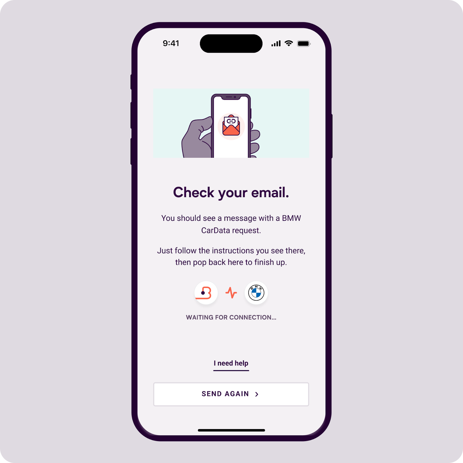 You should see a message with a BMW CarData request. Just follow the instructions in the email, and then pop back to your By Miles app when you’re ready. (If you haven’t received an email, be sure to check the same email address you used when you bought your policy. It may have also ended up in your spam folder.